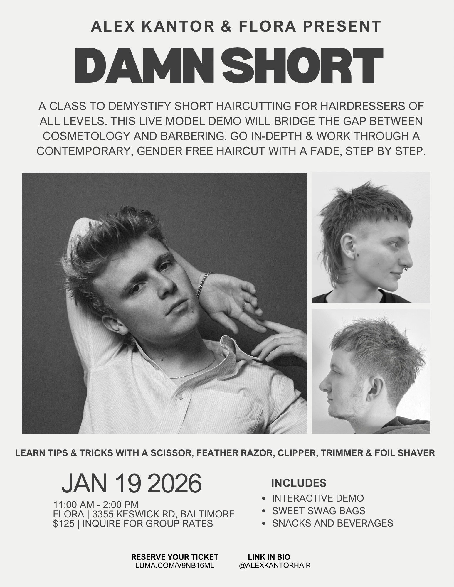 Damn Short is here to demystify short haircutting for hairdressers. This live model demo will bridge the gap between cosmetology and barbering with lots of tips and tricks, using a wide range of tools. The class will go in-depth with each step of the service and together, we will work through a contemporary, gender free haircut with a fade, step by step. Whether you’re a seasoned stylist or just starting out, this class will up your confidence in short haircutting.
